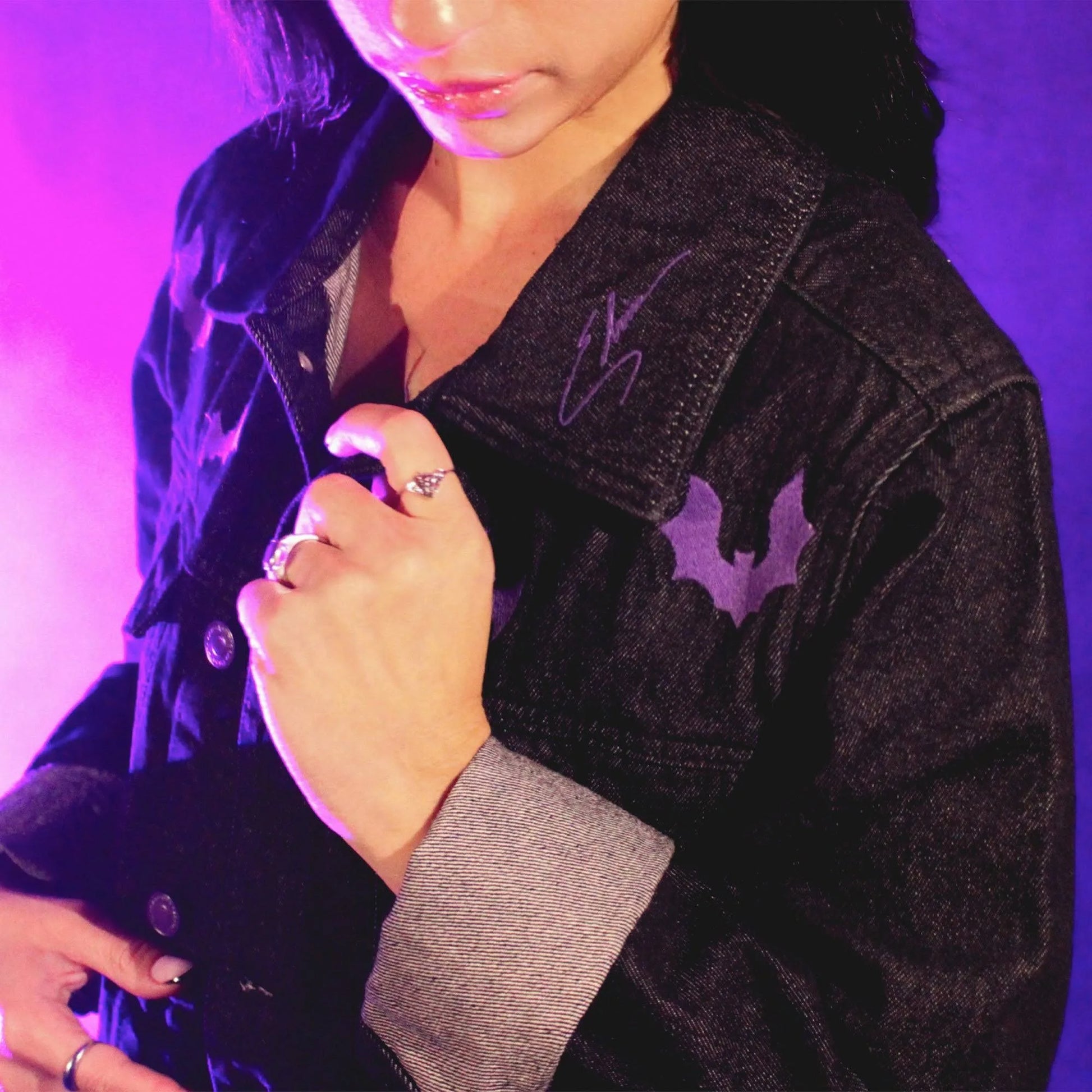 This insanely awesome jacket features embroidered bats on the front along with her signature on the collar. The back has a large embroidered portrait of her!