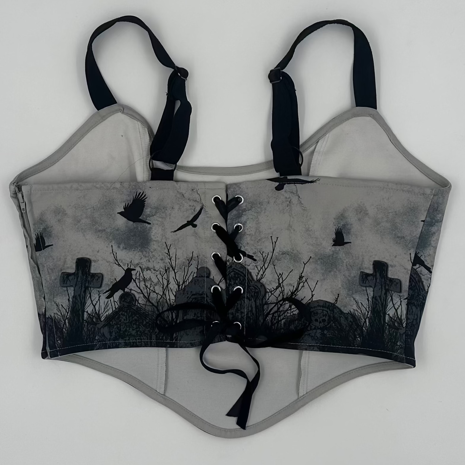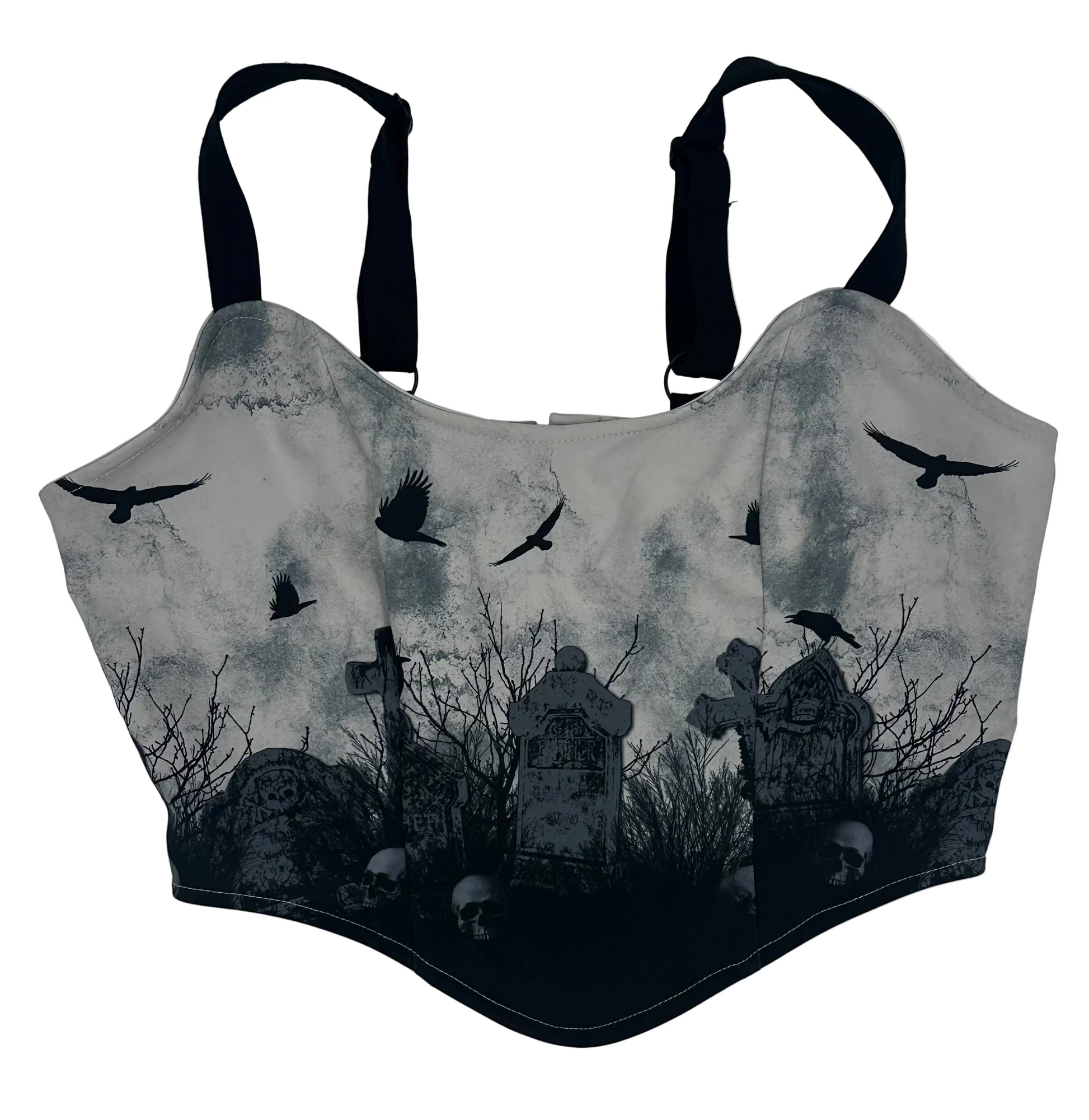 Feel like you've stepped into a dark fairy tale in this mysterious piece! This cropped corset depicts a graveyard scene design and comes with adjustable straps. Complete with lace-up detailing on the back and side zipper closure.